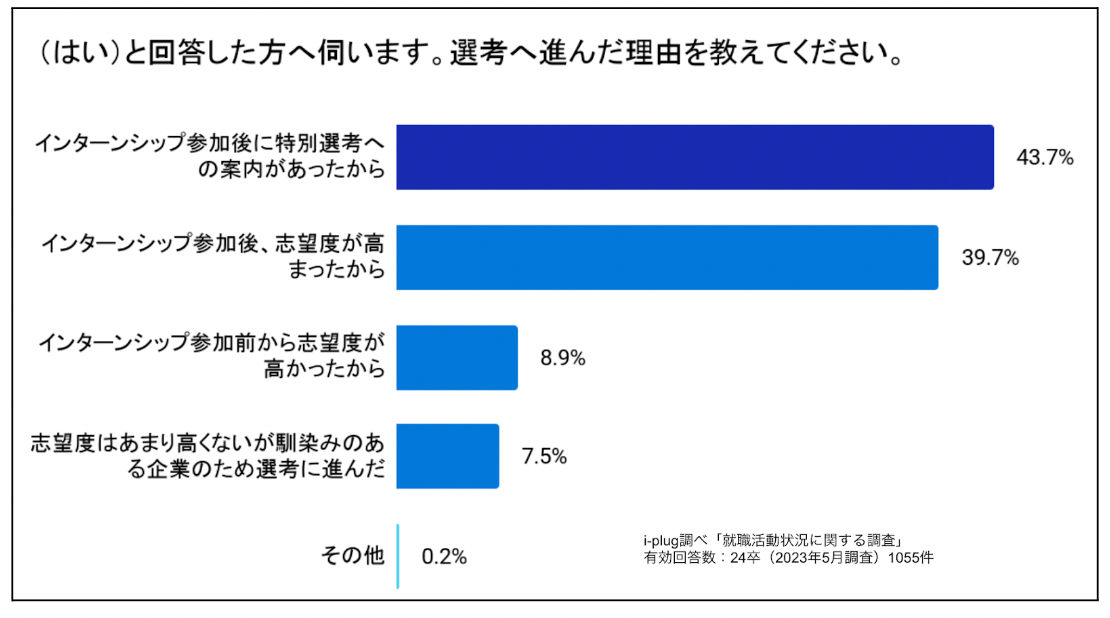 インターンシップへ参加した企業の選考へ進んだ理由で最も多い回答が「インターンシップ参加後に特別選考への案内があったから」でした。次いで、「インターンシップ参加後、志望度が高まったから」が39.7%でした。一方で「参加前から志望度が高かったから」と回答した学生はわずか8.9%。インターンシップへの参加が、志望度に大きな影響を与えることが推察できます。