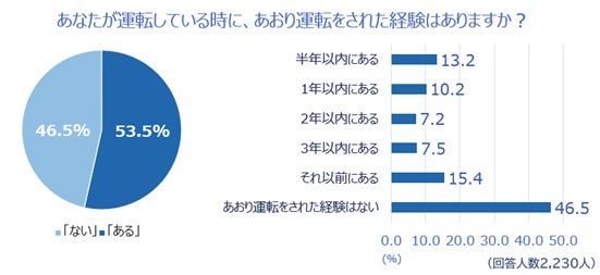 1. あおり運転をされた経験があるドライバーは53.5%と、2018年の調査開始時(70.4%)よりは減少しているものの、依然として半数を占める結果に。