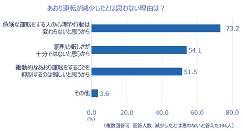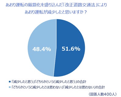 悪質なあおり運転に起因する事件、事故が多発し、あおり運転に対する問題意識が高まっています。2020年6月には、あおり運転の厳罰化を盛り込んだ「改正道路交通法」が施行されました。この法改正によりあおり運転が減少したと思うかとの問いでは、「減少したと思う」と回答したドライバーは51.6%となりました。また、「減少したとは思わない」と回答した人は、理由として「危険な運転をする人の心理や行動は変わらないと思うから(73.2%)」が最も多く、「罰則の厳しさが十分ではないと思うから(54.1%)」が続きました。