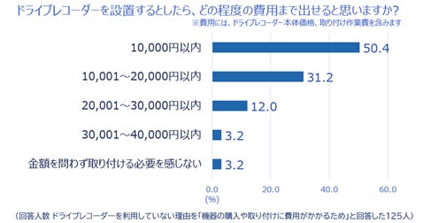 ドライブレコーダーを利用していないドライバーを対象に、その理由を聞いたところ、「機器の購入や取り付けに費用がかかるため」が62.5%で最も多くなりました。また、「ドライブレコーダーを設置するとしたら、どの程度の費用まで出せると思いますか?」との問いには、10,000円以内が50.4%、20,000円以内が31.2%と回答しました。なお、「金額を問わず取り付ける必要を感じない」人は3.2%と少ない結果となりました。