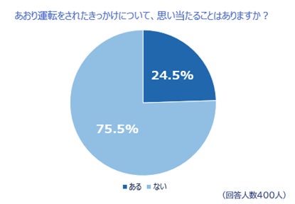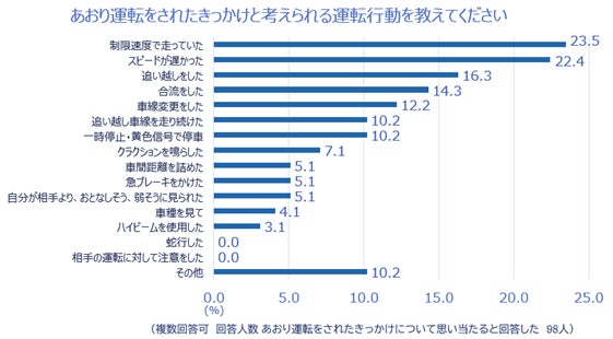 あおり運転をされたきっかけについて、思い当たることがない人が75.5%と、多くを占める結果となりました。「思い当たることがある」と答えた人にきっかけと考えられる運転行動を聞いたところ、「制限速度で走っていた(23.5%)」「スピードが遅かった(22.4%)」と続き、あおり運転のきっかけと考えられる行動は、運転速度に関するものが多い結果となりました。