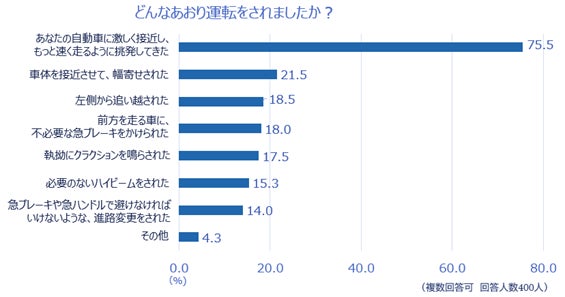 3. 遭遇したあおり運転は、「あなたの自動車に激しく接近し、もっと速く走るように挑発してきた」が75.5%と最多。その際にとった対処方法としては「道を譲った」「何もしなかった」「他の道に逃げた」など、あおり運転をやり過したドライバーが目立つ結果に。