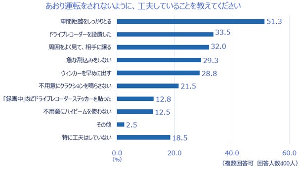 あおり運転を受けたことがあるドライバーに、あおり運転をされないように工夫していることを聞いたところ、「車間距離をしっかりとる(51.3%)」「ドライブレコーダーを設置した(33.5%)」「周囲をよく見て、相手に譲る(32.0%)」と続き、周りのドライバーを刺激しない運転を心がけるとともに、ドライブレコーダーを設置することであおり運転をされないよう対策をとる人が目立ちました。