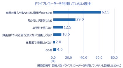 9. ドライブレコーダーを利用していない理由としては、「機器の購入や取り付けに費用がかかるため(62.5%)」が最多。