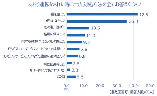 遭遇したあおり運転について聞いたところ、「あなたの自動車に激しく接近し、もっと速く走るように挑発してきた」が75.5%、続いて「車体を接近させて、幅寄せされた」が21.5%でした。また、その際にとった対処方法は、「道を譲った(42.5%)」「何もしなかった(36.0%)」「他の道に逃げた(13.5%)」と続き、あおり運転をやり過ごしたドライバーが目立つ結果となりました。