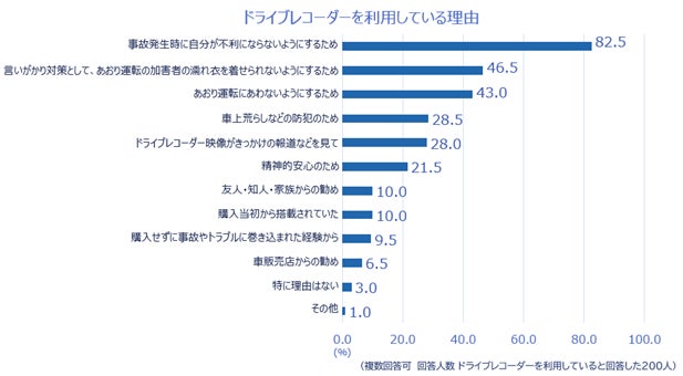ドライブレコーダーを利用している理由は「事故発生時に自分が不利にならないようにするため(82.5%)」が最も多い結果となりました。また、現在使用しているドライブレコーダーについて、導入のきっかけは「自動車事故やあおり運転のトラブルに関する報道・記事を見たため(59.5%)」「安全運転意識を高めるため(32.5%)」「防犯対策のため(30.5%)」と続きました。