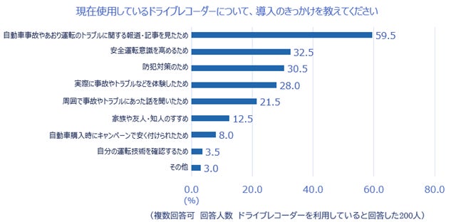 8. 現在ドライブレコーダーを利用している理由は「事故発生時に自分が不利にならないようにするため(82.5%)」が最多。加えて、現在使用しているドライブレコーダーの導入のきっかけは、「自動車事故やあおり運転のトラブルに関する報道・記事を見たため(59.5%)」「安全意識を高めるため(32.5%)」と続く。