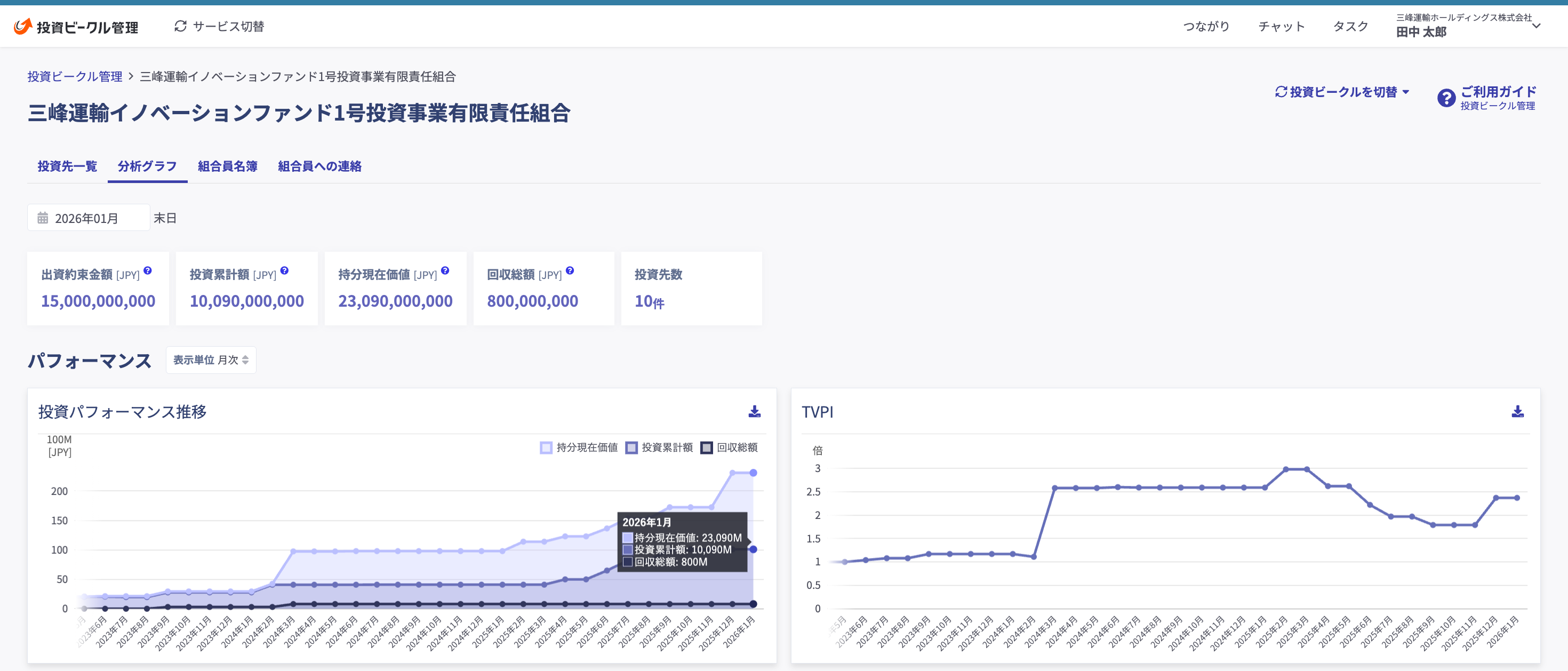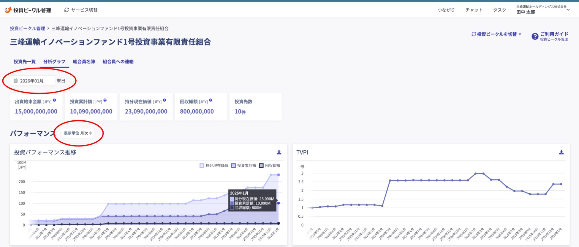 「分析グラフ」機能は、投資金額や持分現在価値などの、投資先スタートアップやLP出資ファンドのデータを活用し、実績ベースのパフォーマンスをグラフやレポート形式で閲覧できる機能です。