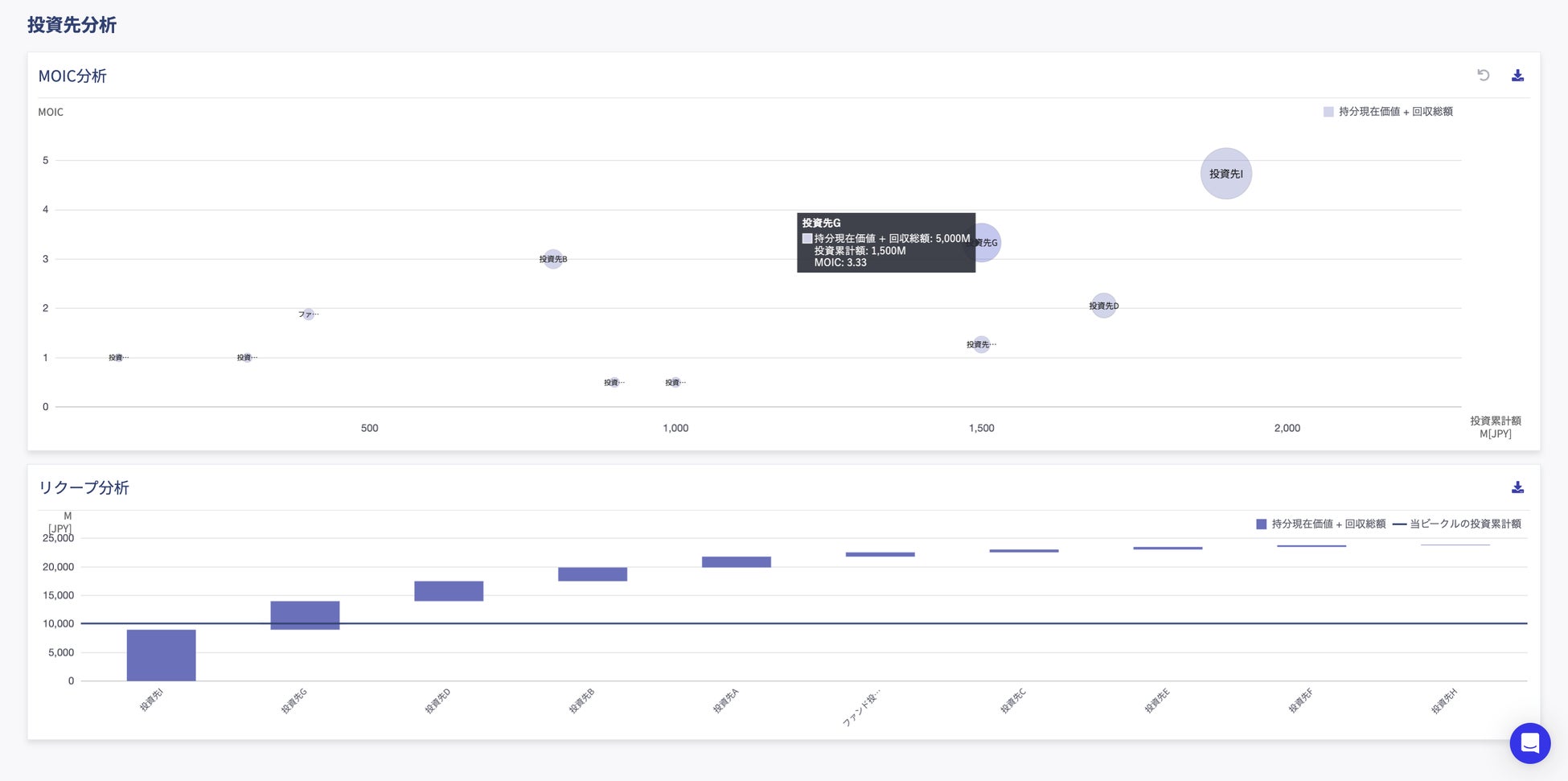 投資日や投資金額、持分現在価値、回収額などの実数値に基づいた個社の正確なデータを参照し、TVPI・DPI・RVPI・投資パフォーマンス推移が直感的なグラフで確認できます。また、MOIC分析やリクープ分析の結果も自動で可視化され、ポートフォリオ全体における影響度も見ることができます。