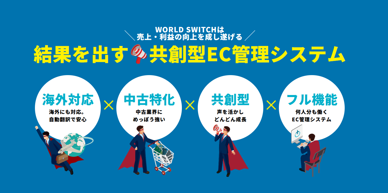 「WORLD SWITCH」は一括出品・受注、買取管理・在庫連携を備えた、簡単に複数モール管理ができる中古品業者特化型ECショップ一元管理システムです。各作業での時間短縮、業務の現状を劇的に改善し効率化することで、ショップの売上・利益の向上を図ります。