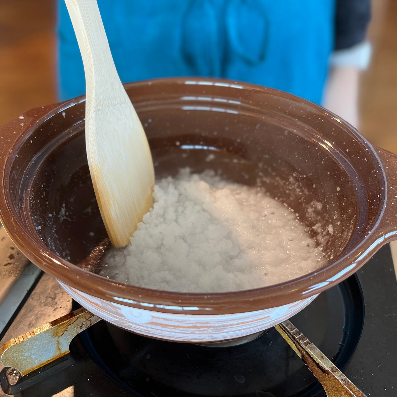 AMAMI TERRACEの店舗内で、塩を炊いて味わいを感じることができる、実演販売をしています。1日4時間程度じっくり炊き上げ、大粒の塩に仕上げています。