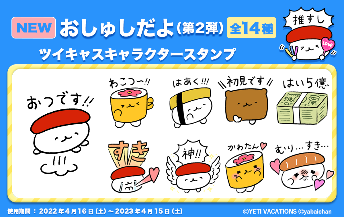 2021年よりツイキャスに登場したイラストレーター「やばいちゃん」によるお寿司をモチーフにした大人気キャラクター『おしゅしだよ』のスタンプ。ご好評につき、この度第2弾が登場いたしました。