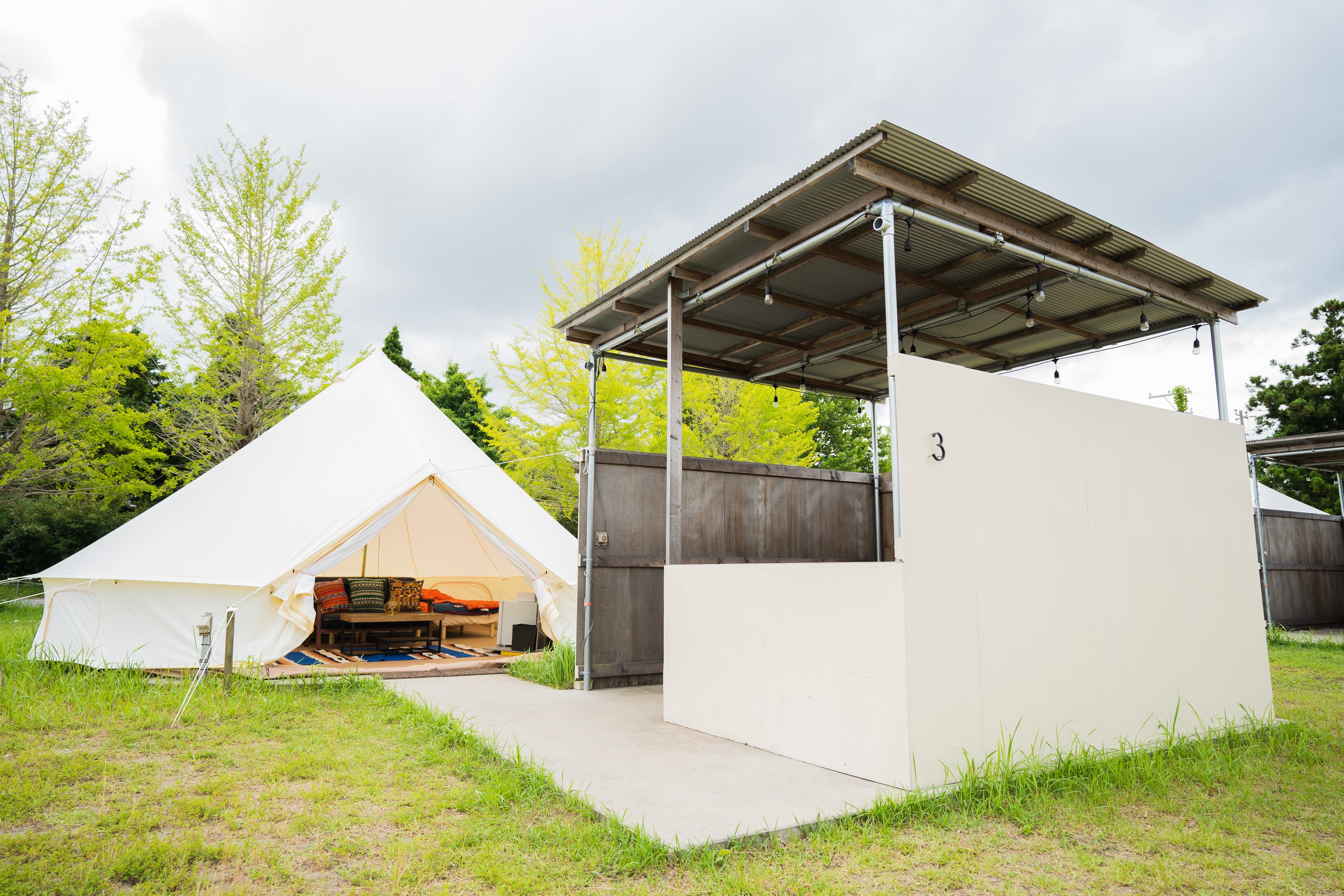テント内にはエアコン・冷蔵庫付きで、屋根付きのデッキスペースもございます。