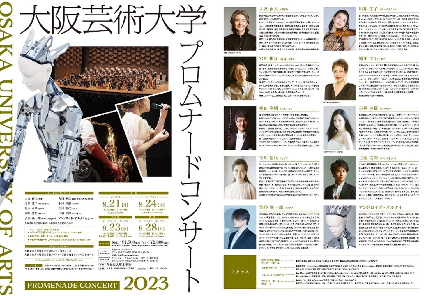 指揮は本校の教授であり、日本フィルハーモニー交響楽団をはじめとする数多くの指揮台に立ち、日本の音楽界をリードし続けている大友直人が務めます。また、8月24日(木)に大阪にて開催するオーケストラステージでは、大阪芸術大学アートサイエンス学科客員教授であり音楽家・渋谷慶一郎と、大阪芸術大学から誕生したアンドロイド・オルタ4も出演します。