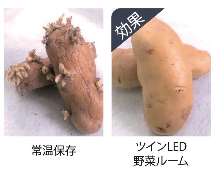 ※8:試験条件:AQR-TZA51P(ツインLED野菜ルーム搭載)と常温を想定したフィールド試験室(15~30℃)にじゃがいもを30日間保存し、保存後の状態を評価しました。当社調べ。