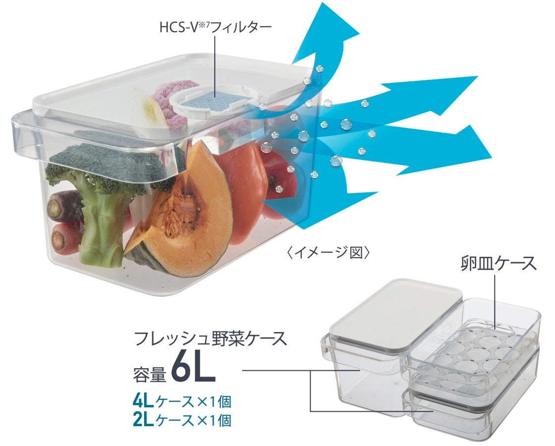 TZシリーズの旬鮮野菜ルームにも搭載している湿度調節フィルター「HCS-Vフィルター(※10)」を上蓋裏に用いたスタッキングタイプの便利なケース。容器内の湿度を調整し、使いかけの野菜や傷みやすい果物なども、ラップなしで約2週間(※11)新鮮に保存することができます。