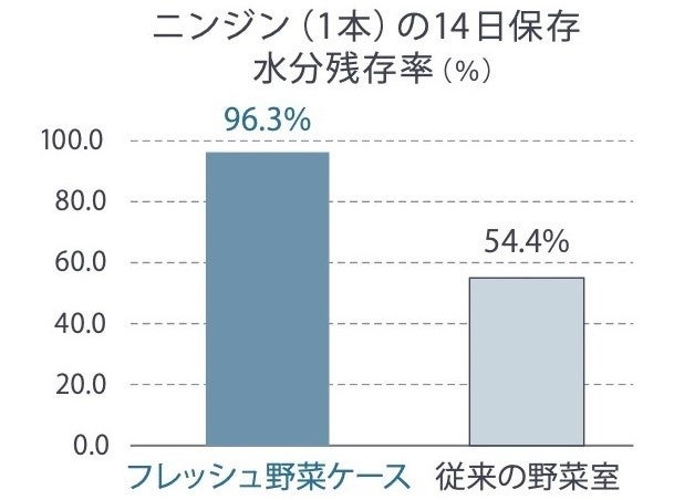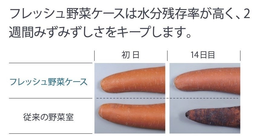 ※11:試験条件/AQR-TZ51PとAQR-SV38J(2019年モデル)を各1台用意し、AQR-TZ51Pの冷蔵室内に設置したフレッシュ野菜ケースを試験区、AQR-SV38Jの野菜室を対照区としました。保存期間を14日間とし、ニンジンの水分残存率を比較しました。2024年3月現在。当社調べ。