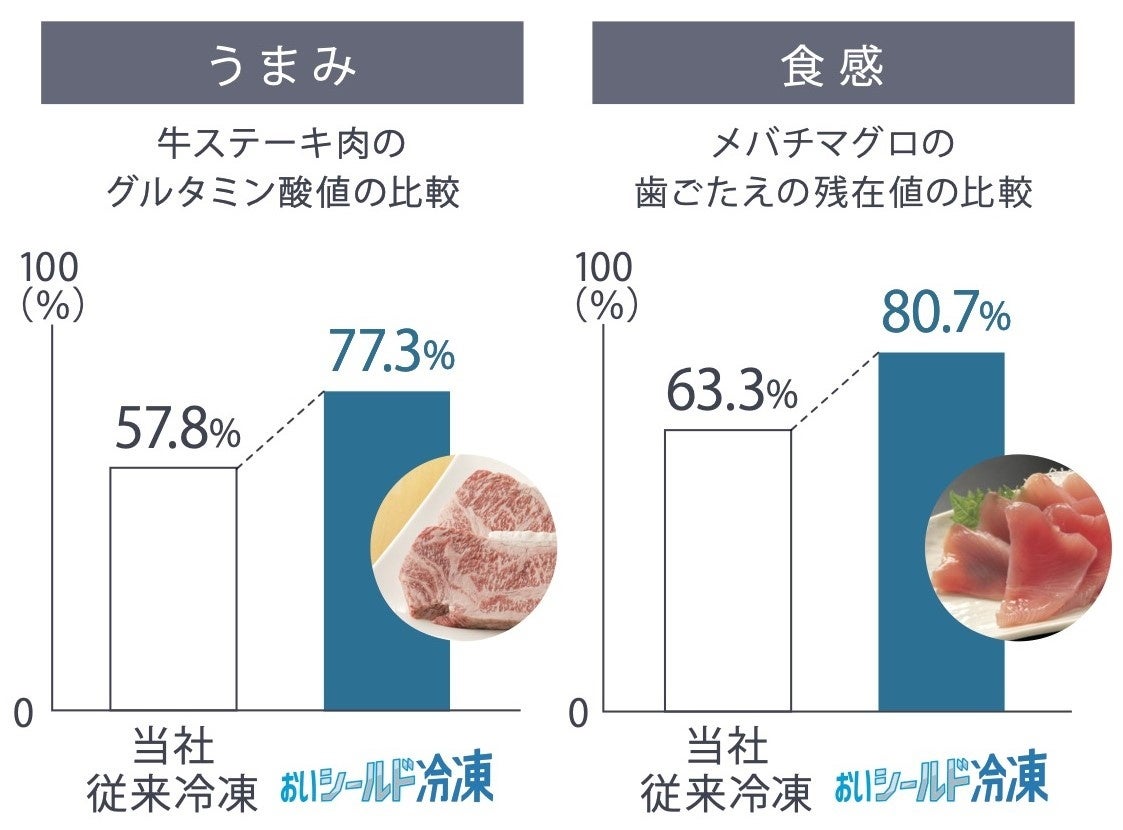 試験条件/ AQR-TZ51Pと2017年モデルAQR-SV27Gを各1台用意し、AQR-TZ51Pの冷凍室を試験区、AQR-SV27Gの冷凍室を対照区としました。保存期間を4週間とし、保存前および保存後にそれぞれの項目を評価しました。牛ステーキ肉は解凍後、真空パックして70℃で60分間湯煎し、常温に戻してロース芯を測定。メバチマグロは冷蔵室で解凍後、そのまま測定しました。試験結果/①牛ステーキ肉のグルタミン酸残存率=AQR-SV27G(ドリップ抑制機能無し)57.8%、AQR-TZ51P(ドリップ抑制機能あり)77.3%。②メバチマグロの食感変化率=購入直後57N、AQR-SV27G(ドリップ抑制機能なし)209N、AQR-TZ51P(ドリップ抑制機能あり)100N。味香り戦略研究所調べ。
