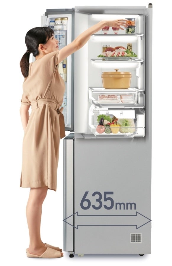 キッチンにピッタリおさまる、業界トップクラス(※3)の薄型設計!動きやすく、料理のしやすい広々としたキッチンを叶えます。庫内が一目で見渡せ、最上段の奥にも手が届きやすいのも、使いやすさのポイントです。