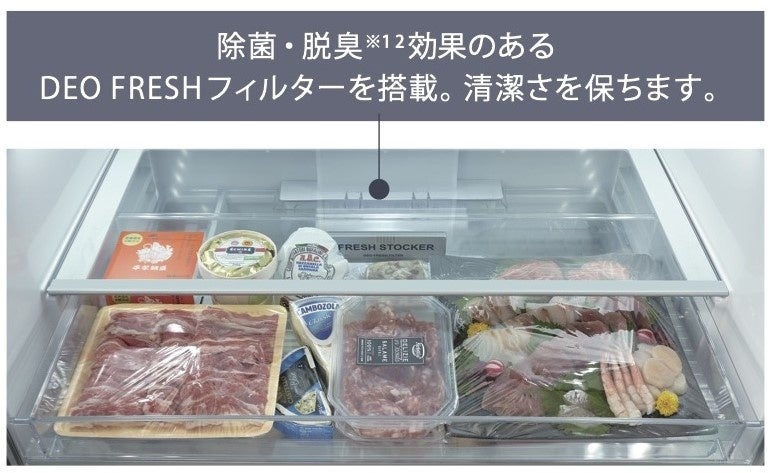 ※12:[DEO FRESH] 除菌・脱臭触媒フィルター 試験依頼先:一般財団法人ボーケン品質評価機構/試験の方法:フィルム密着法/除菌の方法:フィルターへの抗菌成分の担持/処理部品名:チルドルーム内のフィルター/試験結果:99.9%(試験番号 JNLA2017K0053)