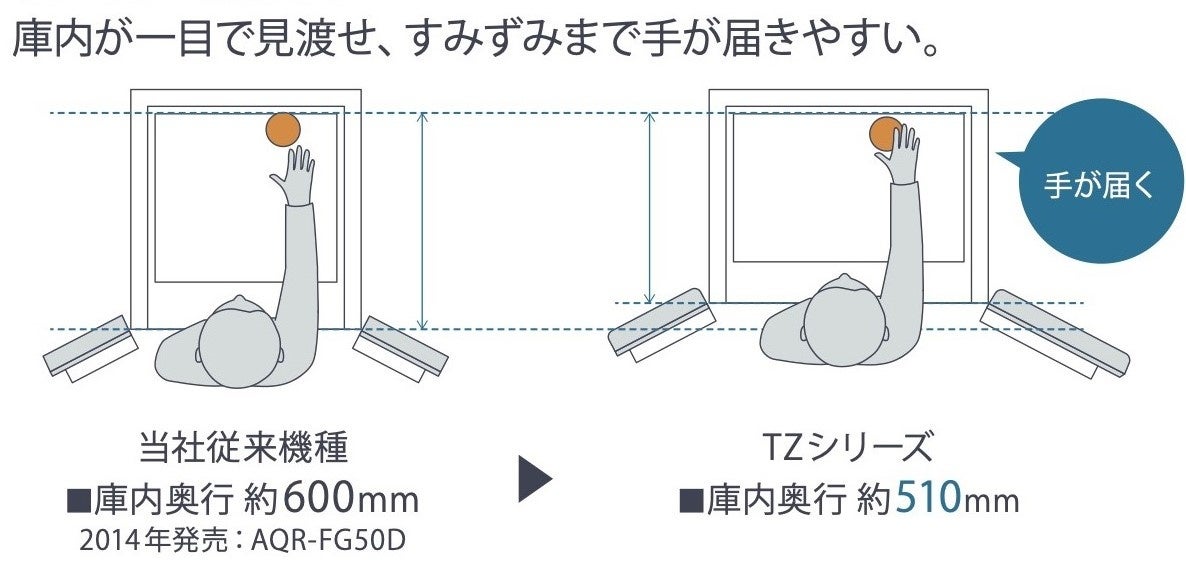 ※1:TZA42P・TZ42P:定格内容積401~450Lクラスの国内家庭用ノンフロン冷凍冷蔵庫において。TZA51P・TZ51P:定格内容積501L~550Lクラスの国内家庭用ノンフロン冷凍冷蔵庫において。2024年3月現在。当社調べ。