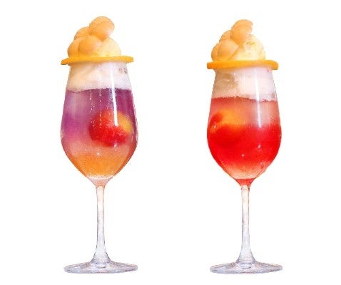 モコモコした白い雲は、梅とヨーグルトと乳酸菌飲料を使った白いエスプーマで表現。どちらも本格梅酒The CHOYAと至極の梅シロップにフローズン完熟南高梅を1粒使用し、しっかりした梅感で酸味が効いた夏にピッタリの味わいに仕上げました。宵空の夜空はバタフライピー、茜空の夕焼けはクランベリーで表現し、スライスオレンジでグラスに蓋をし、バニラアイスと梅最中を乗せました。どちらもアルコールありの酔うタイプとノンアルコールの酔わないタイプからお選びいただけます。