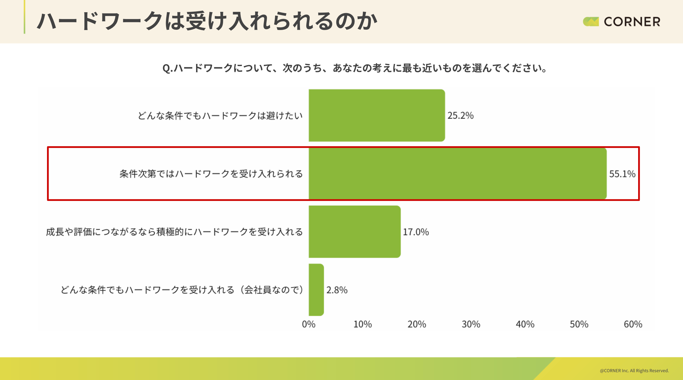 ・ハードワークを「条件次第で受け入れる」が多数派の考え方で、「成長につながる」「正当に評価される」といった条件が受容の前提になっている
