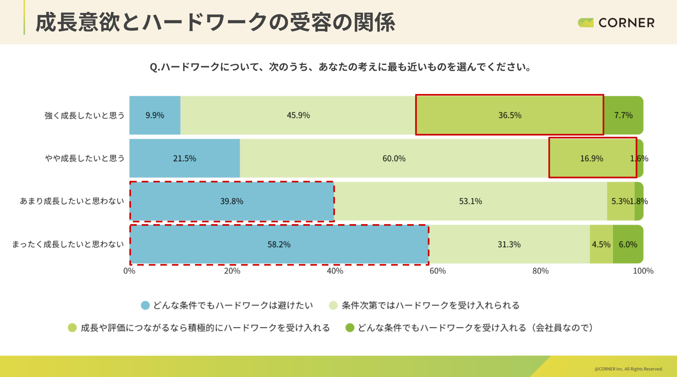 成長意欲別にハードワークの受容度を見ると、成長意欲が高い層ほど「条件付きで受け入れる」「積極的に受け入れる」と回答する割合が高い傾向が見られた。一方で、成長意欲が低い層では「どんな条件でも避けたい」とする割合が相対的に高い。