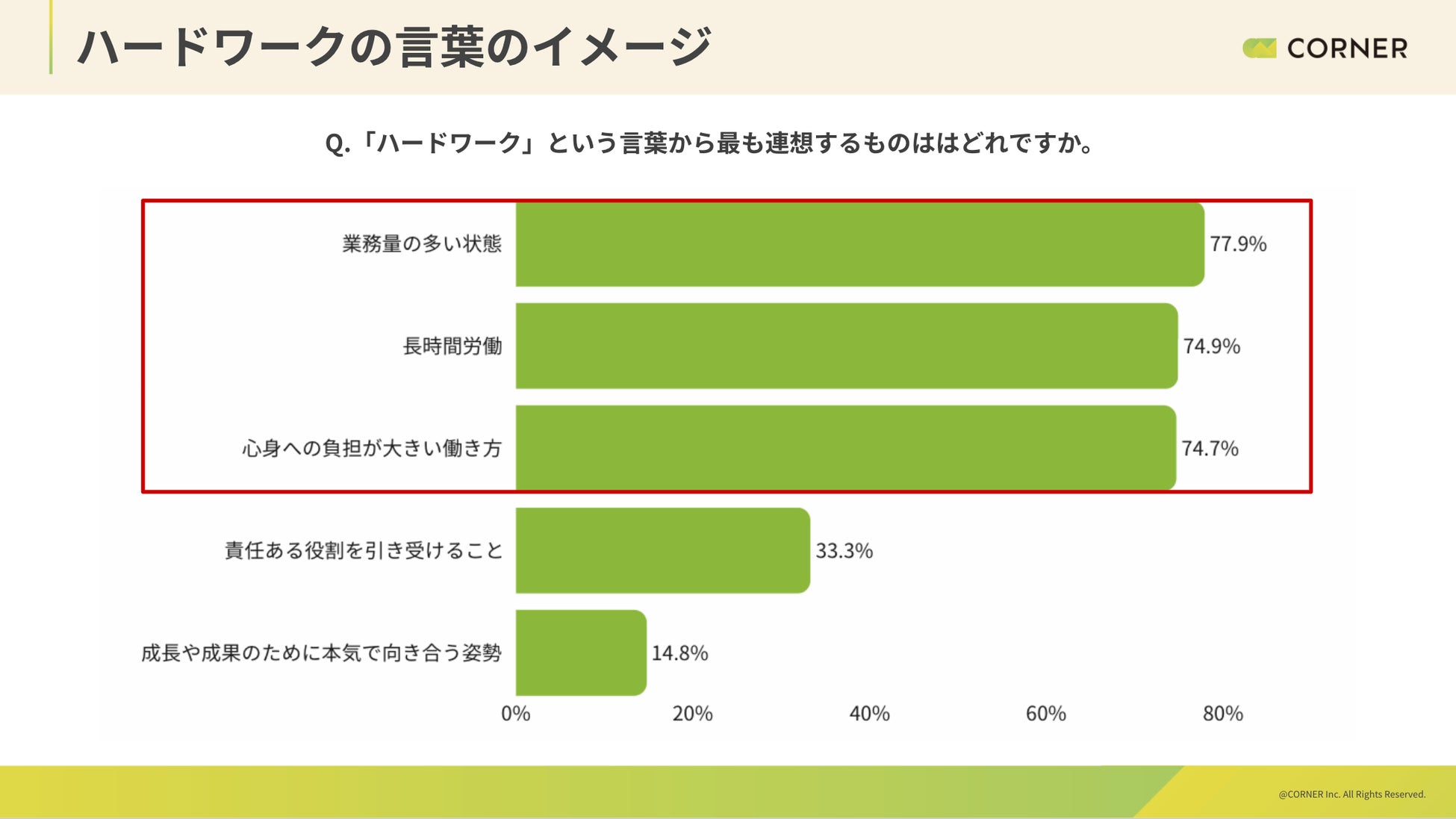 「ハードワーク」という言葉から連想するイメージは、「長時間労働・過重な負荷」といった否定的な意味が多数を占め、言葉自体がネガティブな文脈で受け止められている実態が明らかになっている。一方で、「責任を引き受ける姿勢」「成長のための努力」といった前向きな意味合いで捉える層も一定数存在しており、同じ言葉でも受け止め方が分断されている。