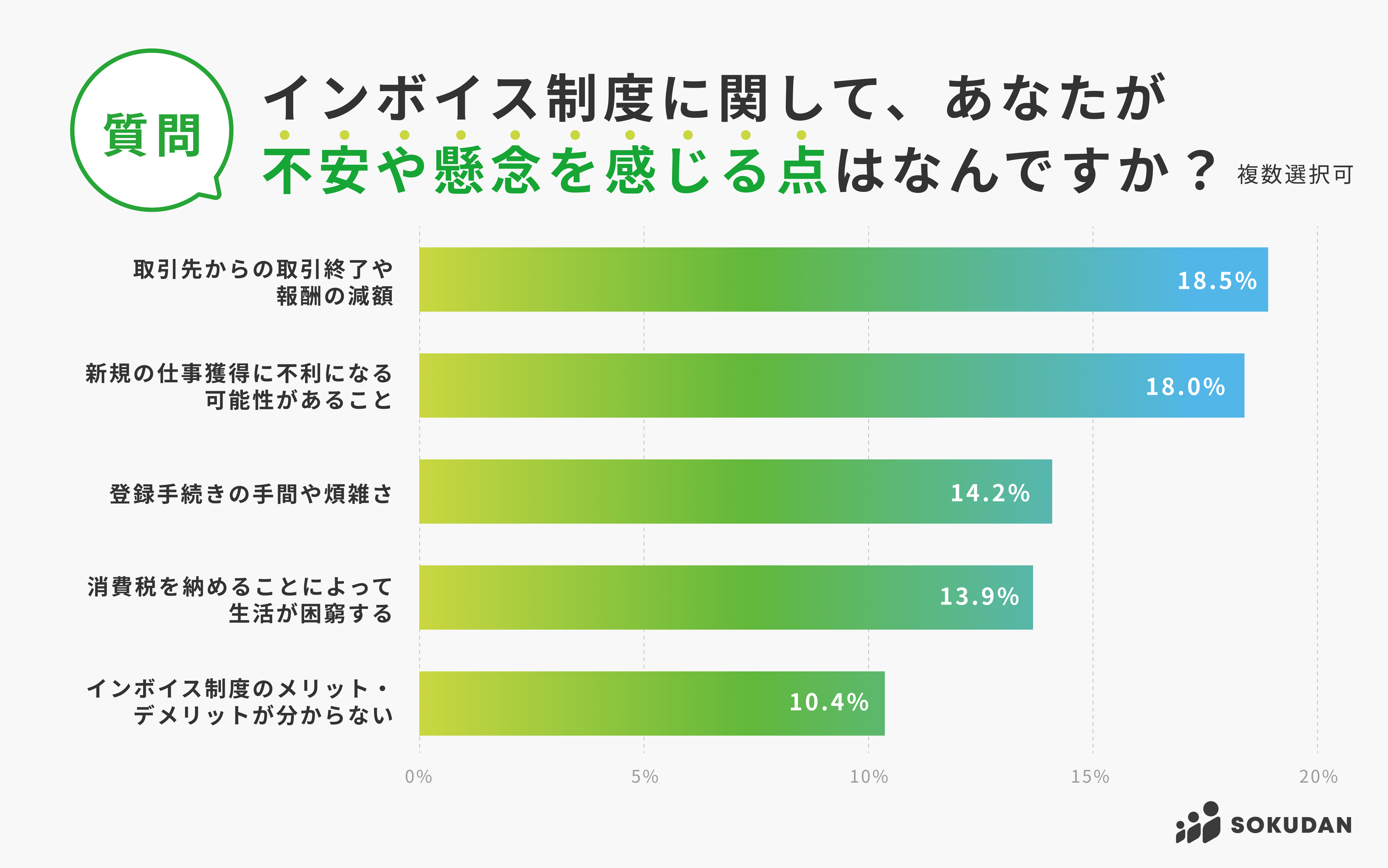 「取引先からの取引終了や報酬の減額」18.5%と「新規の仕事の獲得に不利になる可能性があること」18.0%が上位2つを占めることから、新規や既存の取引に不安や懸念があることがわかる結果となりました。