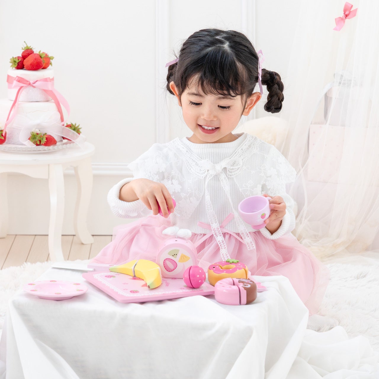 「スウィートカフェリボン プティ」は、ピンクの小箱に子どもたちが大好きなスウィーツやケーキがたくさん詰まったおままごとセットで、楽しく遊びながら手先の器用さや想像力を育むことができるように考えられています。また、“会話を通じて想像力や社会性を育む”ことを大切にしており、二人でも楽しめることを企画の中心に据えています。商品開発には、子どもの遊びと成長を研究する特定非営利活動法人芸術と遊び創造協会が認める「おもちゃコンサルタント」の資格を持つ社員が携わっており、“子どもがおもちゃで遊ぶ一つひとつの動きが、どのように子どもの成長に影響するのか”を丁寧に考えながら、商品づくりに取り組みました。