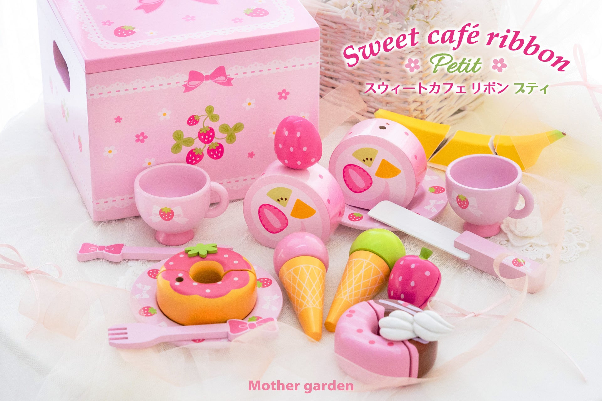 株式会社クリエイティブヨーコ(本社:長野県長野市 代表取締役社長:北原 武幸)は、オリジナルデザインの学童・日用品雑貨や知育玩具などを提案する『マザーガーデン』から、新しい木製おままごとセット「スウィートカフェリボン プティ」を全国の店舗およびオンラインショップで販売を開始しました。