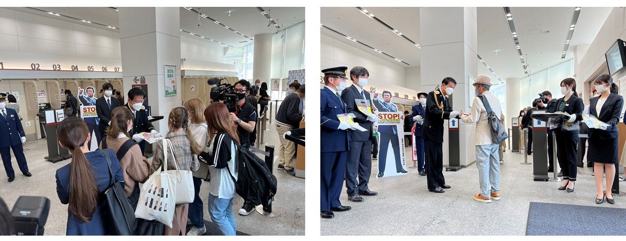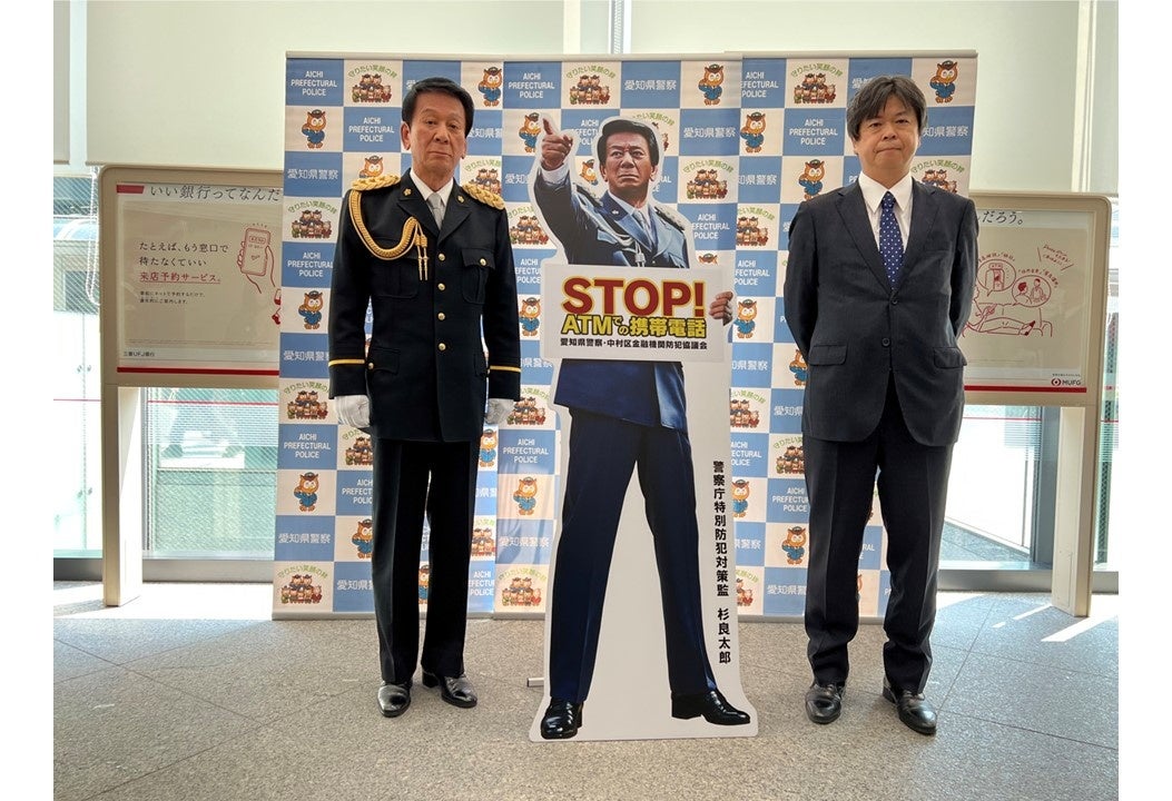 また杉対策監は、三菱UFJ銀行名古屋駅前支店で開催された、「STOP!ATMでの携帯電話」運動による還付金詐欺被害防止の啓発イベントに参加。還付金詐欺の被害防止のためにATMでの携帯電話の通話自粛を呼びかけるべく制作された、自身の等身大パネルのお披露目の場に立ち会いました。その後、杉対策監は銀行に来た県民に向け啓発チラシを配布。自身のパネルとともに、特殊詐欺防止の呼びかけを行いました。