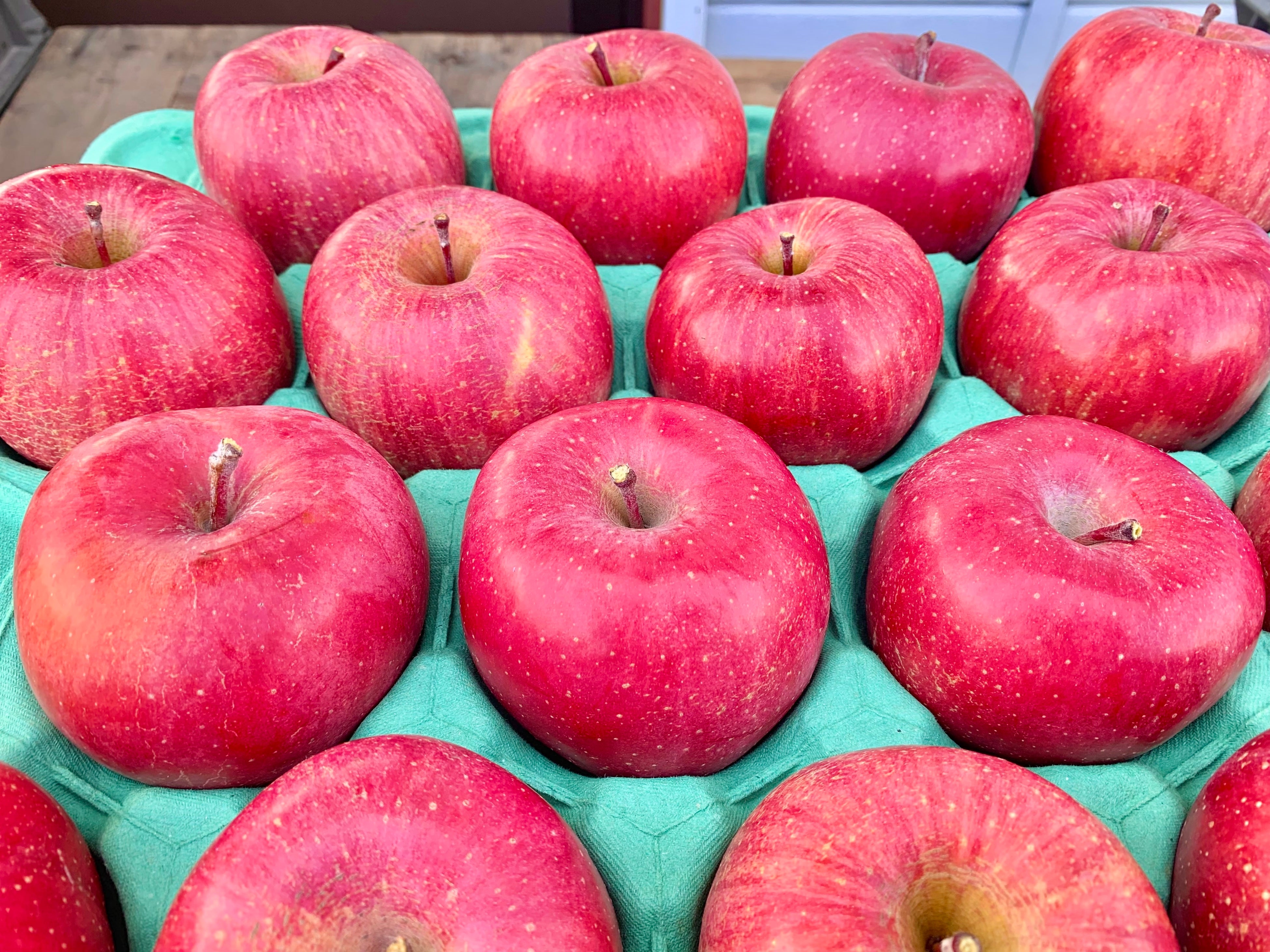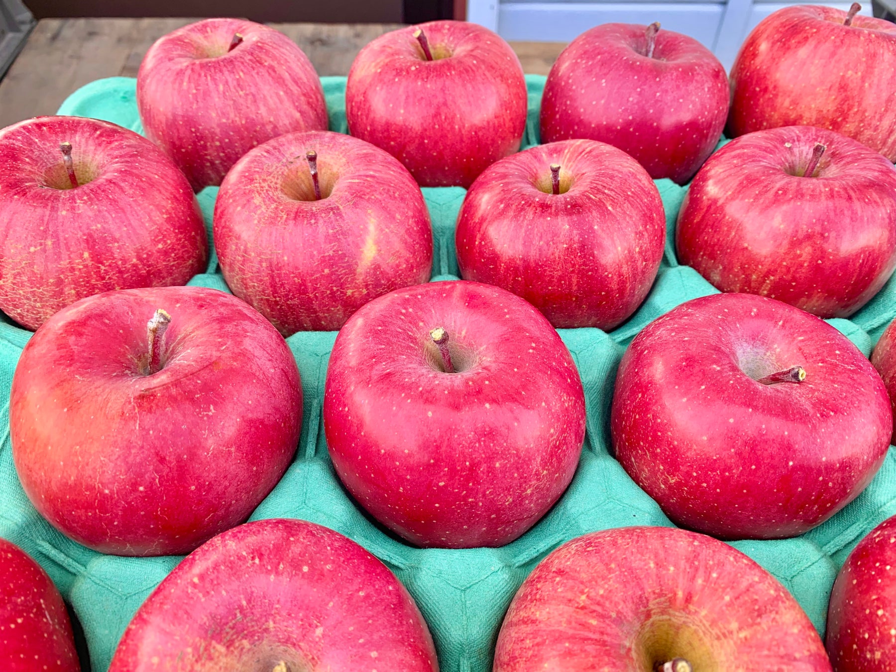 国内生産量No. 1のポピュラーな品種です。袋をかけずに太陽光をふんだんに浴びて栽培しています。果肉の中には完熟の証の飴色の蜜が入り、爽やかな酸味と甘味のバランスが絶妙です。信州りんご『完熟サンふじ』はご家庭用、贈答用どちらでも人気です。
