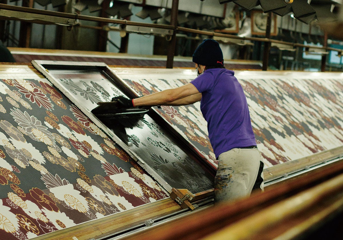 SOU・SOU のテキスタイルは、すべて京都の着物文化を支えてきた染工場による手捺染(てなせん)、別名、京型友禅。型の合わせ具合、重ね合わせによる色の表現など、熟練した職人技を要します。※SOU・SOU の生地には、規制対象の有害物質(24 種類の特定芳香族アミン)を生成するアゾ染料を使用しておりません)