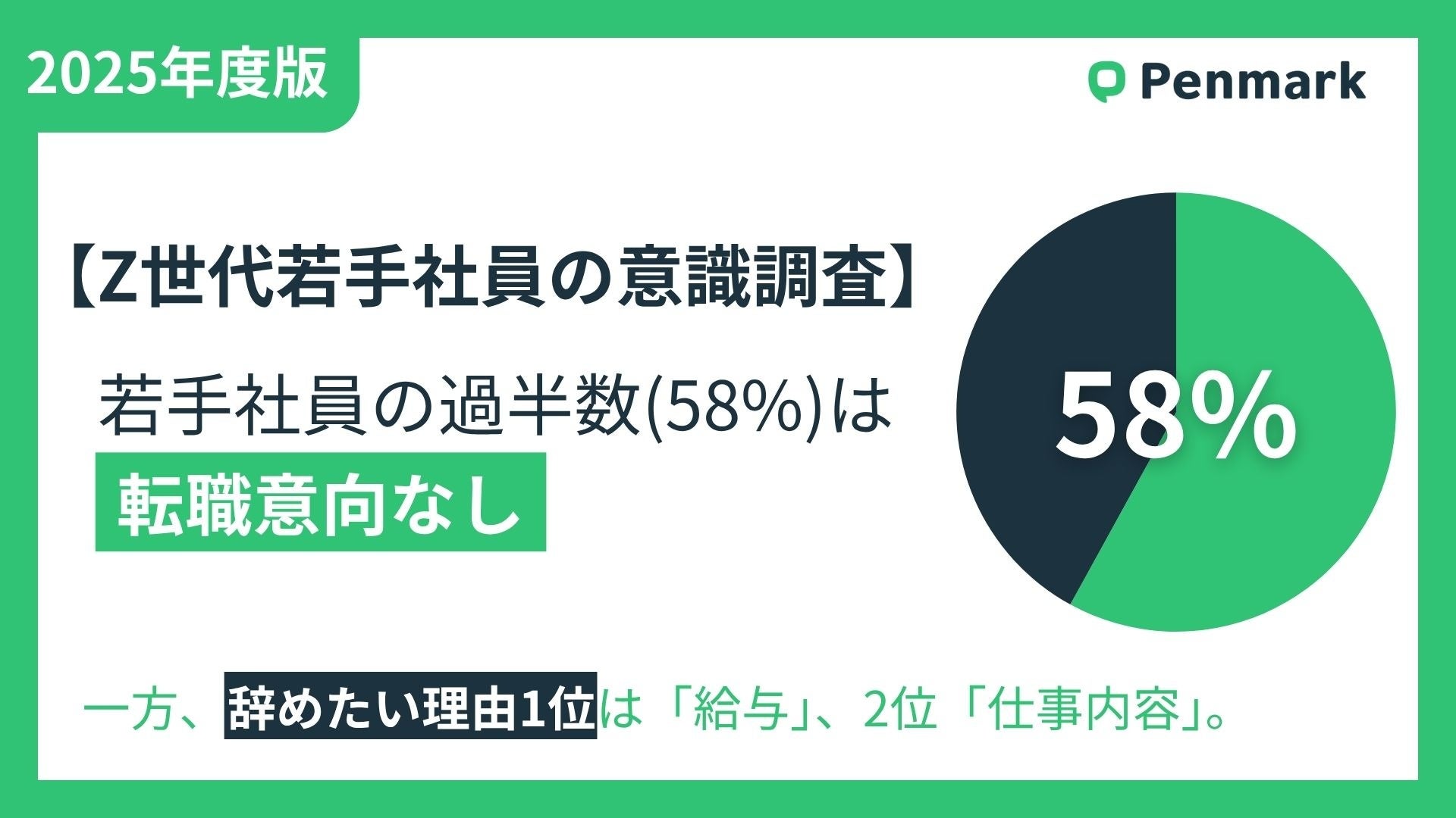 株式会社ペンマーク(本社:東京都目黒区、代表取締役:横山直明、以下ペンマーク)は、全国のZ世代の若手社会人を対象に、Z世代の就業意識調査の一環として「現在の会社に対する転職意向とその理由」に関するアンケート調査を実施しました。