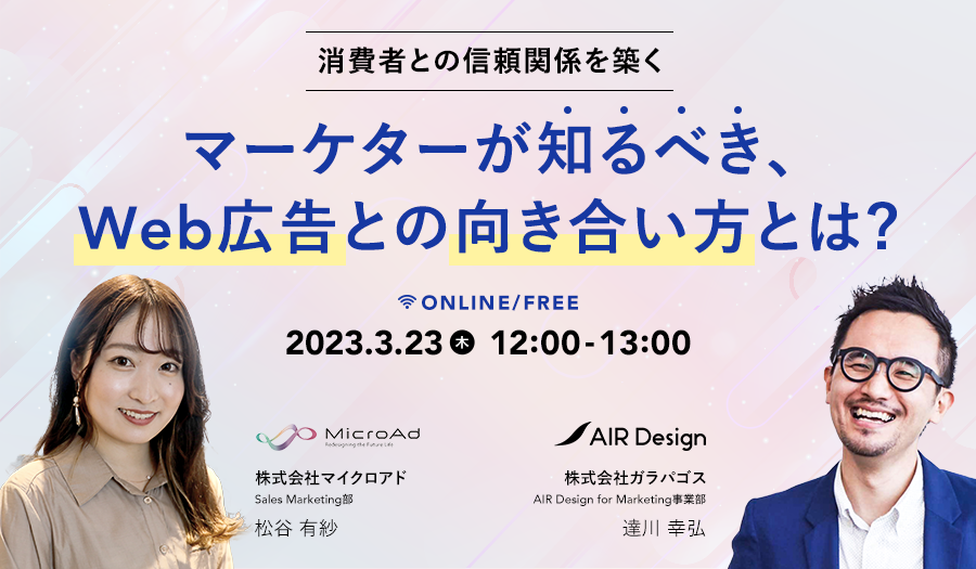 マーケティングのプロによるAIを活用した広告クリエイティブ制作・改善サービス「AIR Design(エアデザイン)」を展開する株式会社ガラパゴス(本社:東京都千代田区、代表取締役:中平健太、以下 ガラパゴス)は、株式会社マイクロアド(本社:東京都渋谷区、代表取締役 社長執行役員:渡辺健太郎、以下 マイクロアド)と共催で、3月23日(木) 12時より、無料オンラインセミナー【〜消費者との信頼関係を築く〜マーケターが知るべき、Web広告との向き合い方とは?】を開催します。