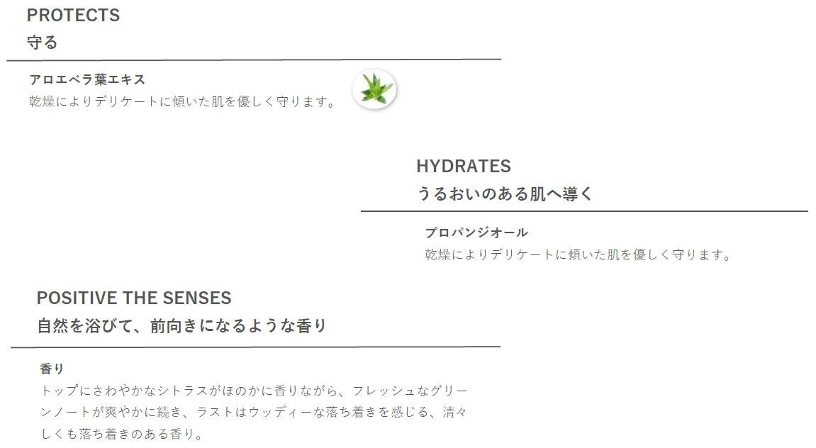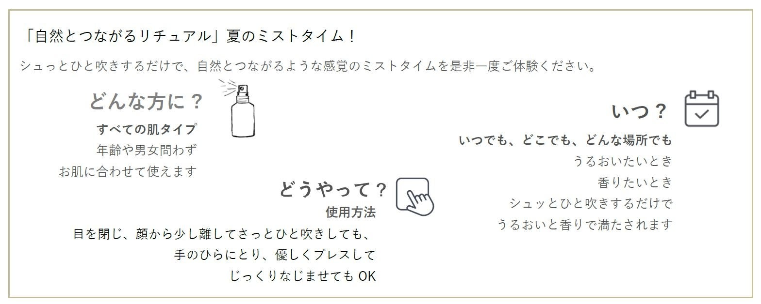 きめ細かなミストが肌に優しく広がり、瞬時にうるおいを与えます。 「自然を浴びて、前向きになるようなフレッシュグリーン」の香り。