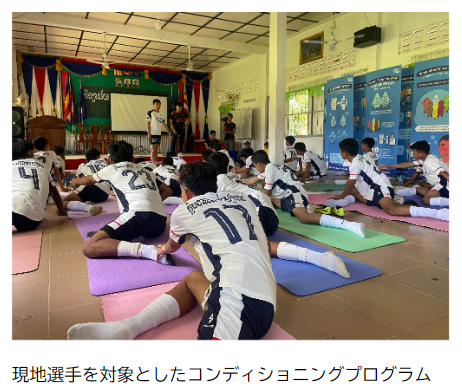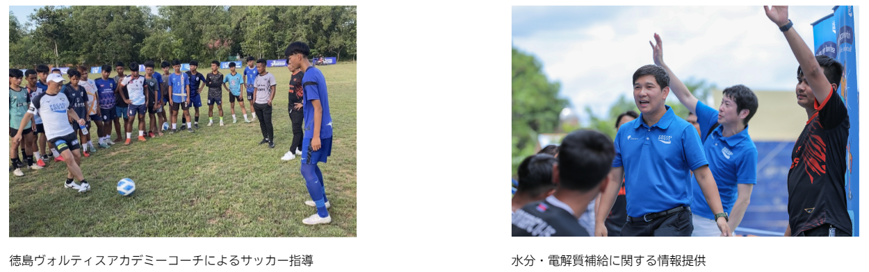 当プロジェクトの第3弾となる今回は、カンボジアのプロサッカークラブ「アンコールタイガーFC」協力のもと、徳島ヴォルティスジュニアユース U-14 の選手およびスタッフが同国のシェムリアップ州を訪問し、現地のジュニアユース世代のチームとの国際親善試合を行いました。併せて、徳島ヴォルティスは現地選手を対象にアカデミーコーチによるサッカークリニックとコンディショニングプログラムを実施し、当社は選手と指導者を対象とした水分・電解質補給に関する情報提供を行いました。
