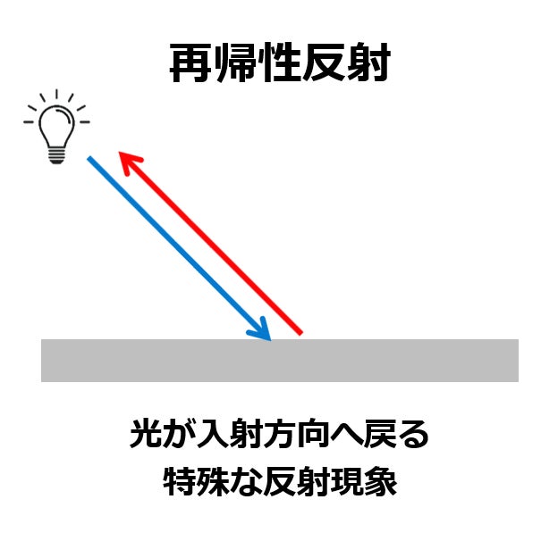 再帰性反射とは、光がどの方向から入射しても、光源の方向へ反射するという、特殊な光の反射現象で(図2)、光源側から対象物を見た際に、対象物が非常に明るく輝いて見えるという特徴があります。視認性が向上するため、特に夜間や暗い場所での安全確保に適しており、道路標識や安全ベストの反射帯などに応用されています。