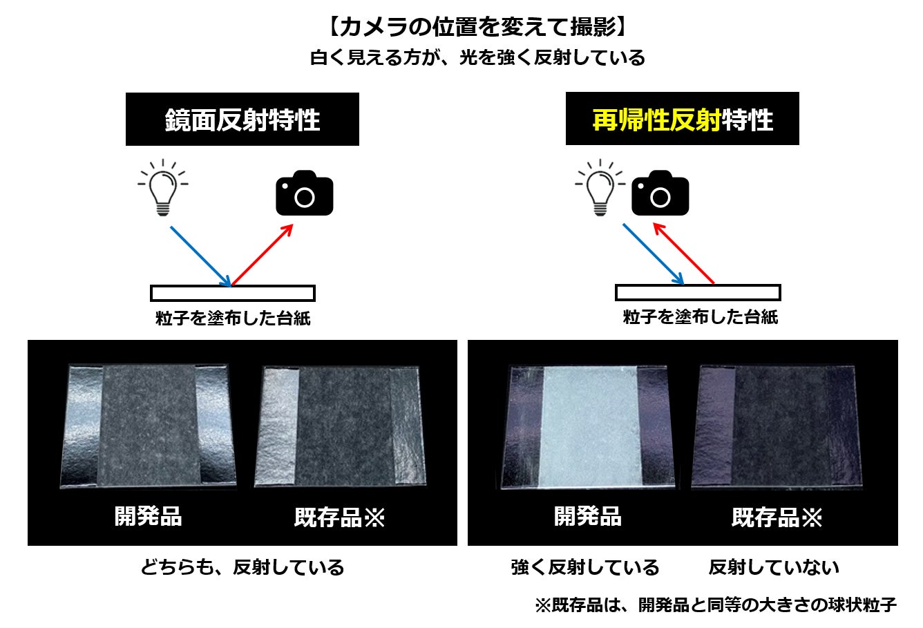 今回開発した再帰性反射特性を持つ新規な球状粒子を用いて、光の反射特性を確認したところ、既存品と同等の鏡面反射特性を備えつつ、既存品にはない再帰性反射特性をもつことが確認されました。