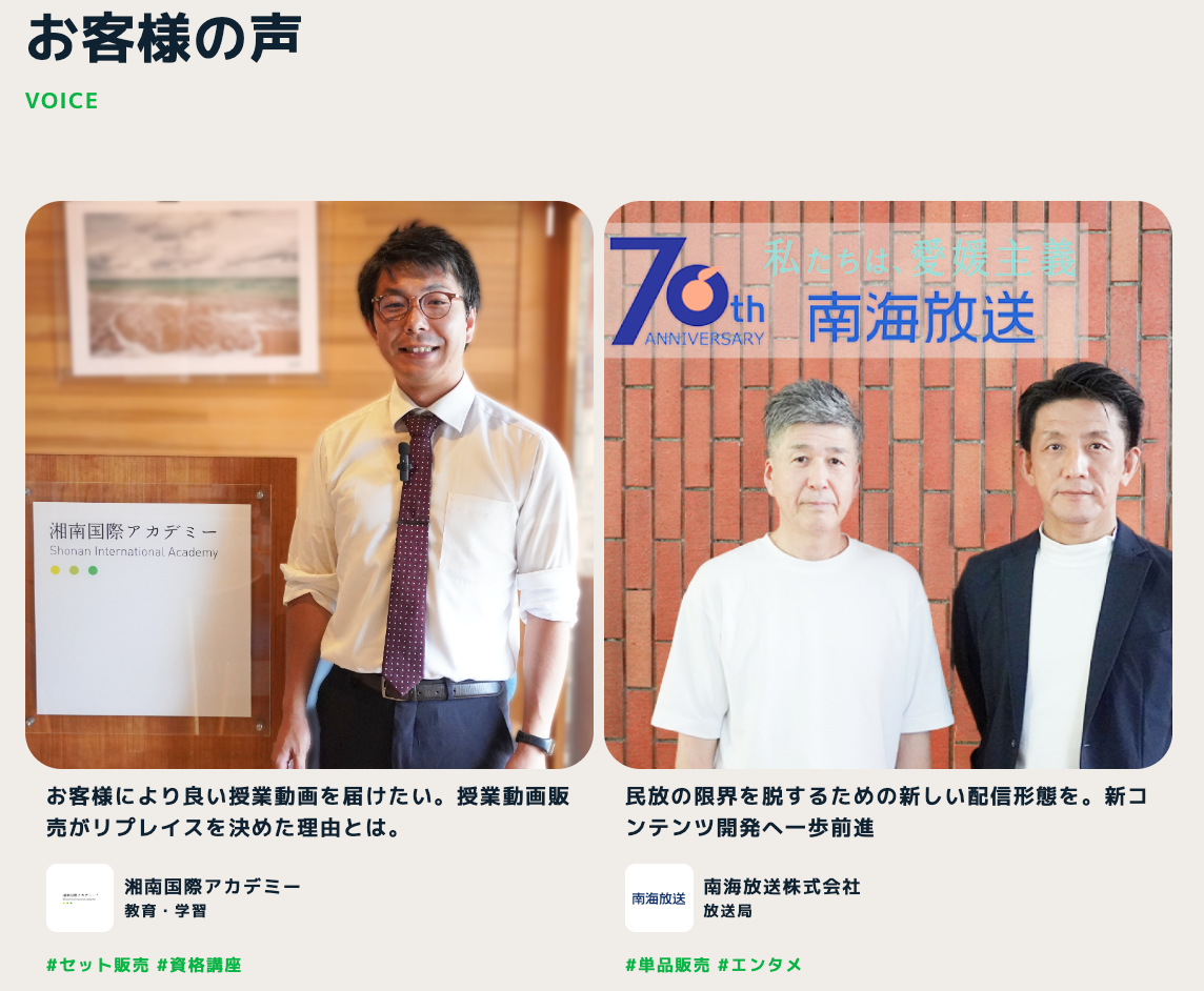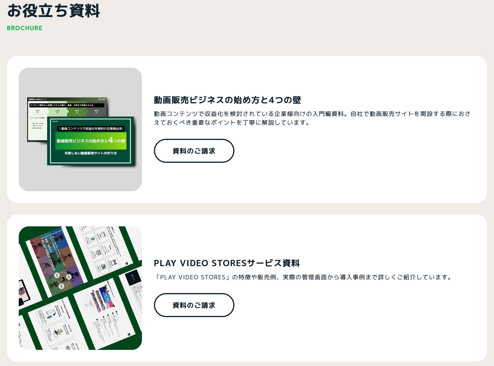 リニューアルでは、実際にPLAY VIDEO STORESを導入されたお客様の導入事例や、サービス活用に関するセミナーページ、お役立ち資料ページを新たに作成しました。 これから導入を検討するお客様に、より必要な情報を幅広くお届けできるコンテンツが充実しています。