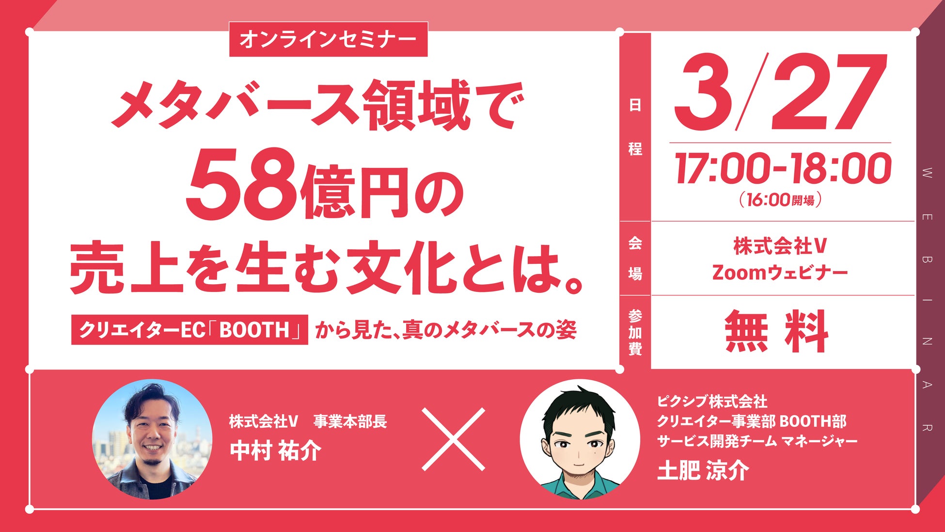 株式会社V(本社:東京都品川区、代表取締役兼CEO:藤原光汰、以下 V)は、2025年3月27日(木)17:00時より、オンラインセミナー「メタバース領域で58億円の売上を生む文化とは。クリエイターEC「BOOTH」から見た、真のメタバースの姿」を開催することをお知らせいたします。ピクシブ株式会社 クリエイター事業部 BOOTH部 サービス開発チーム マネージャー 兼 3D事業部 3Dビジネス室 土肥 涼介 様をお迎えし、「BOOTH」を中心としたメタバース業界の実情と未来についてお話を伺います。