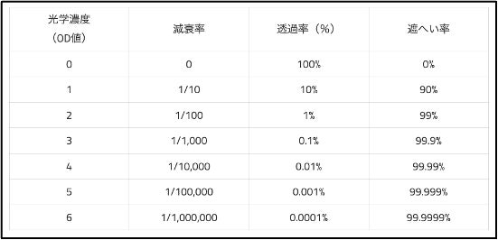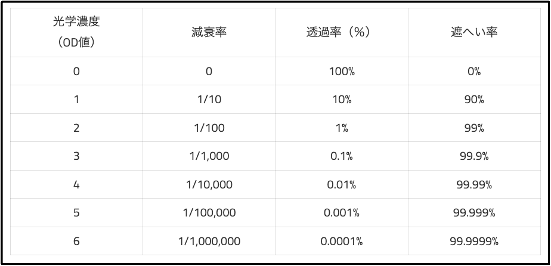 レーザー光の特定波長を遮るレーザー保護メガネは、OD値が高くなるほど透過率は低くなり、目にとって安全になります。例えば、CW 1kWレーザー光をOD値4のレーザー保護メガネに透過させると、10Wまで減衰されます。