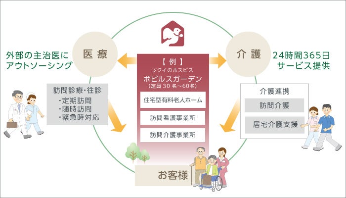 ツクイのホスピス「ポピルスガーデン」は、医療機関での終末期看護の機能を外部の主治 医にアウトソーシングし、お客様が個々に契約された介護・医療事業者と連携することで、 総合的な医療ケアサービスを提供いたします。 また、「ツクイ・ポピルスガーデン豊田」では、「訪問看護」「定期巡回・随時対応型訪問 介護看護」事業所を併設しており、夜間帯もスタッフが常駐しているため、お客様にもご家 族にもご安心いただけるサービス提供体制を整えています。 今後、ツクイは訪問看護に加えて、ホスピスの出店を加速することによる医療事業の拡大 を通じて、地域包括ケアを進化させ、『お客様が住み慣れた地域で自分らしく最期まで暮ら すことができる社会の実現』に向けて一層のサービス拡充に取り組んでまいります。