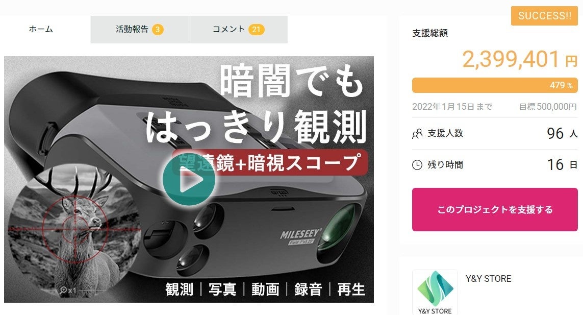 大変多くの方にご支援いただいた結果、現在、本プロジェクト:暗視スコープ「MILESEEY BNV20」は96名様からご支援を賜っており、2,399,401円の支援金額を達成いたしました!