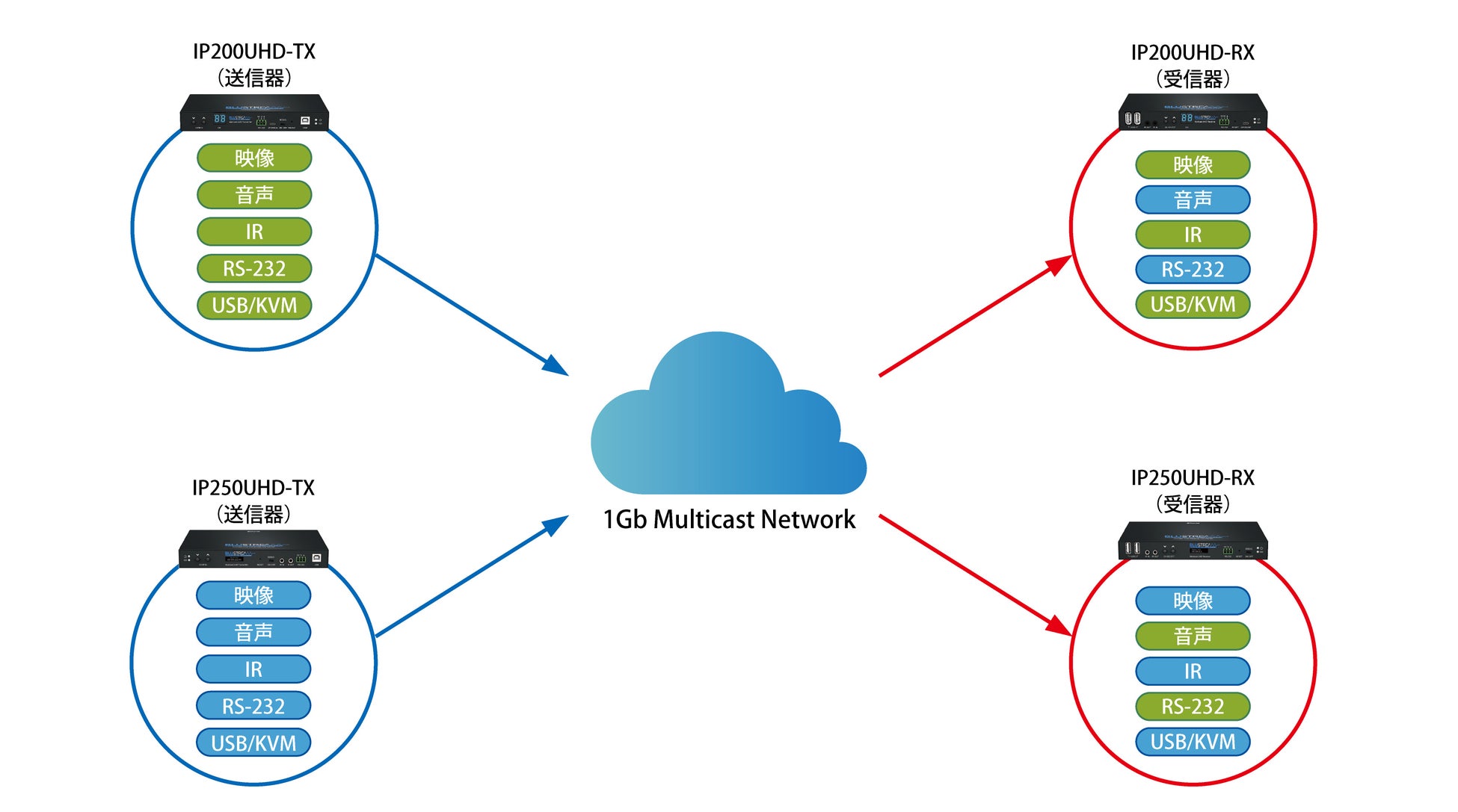 Dante対応マルチキャストUHD は、1Gbネットワークスイッチを介して4K HDMI信号を低遅延で伝送します。独自ロスレス圧縮技術の採用でHDMI、IR、RS-232、USB/KVM、及びDanteオーディオ信号を1本のLANケーブルを使用して最大100m伝送します。また、1対1伝送以外にもネットワークスイッチを介したマトリックス伝送、ビデオウォール表示や1対多(マルチキャスト)伝送が可能です。
