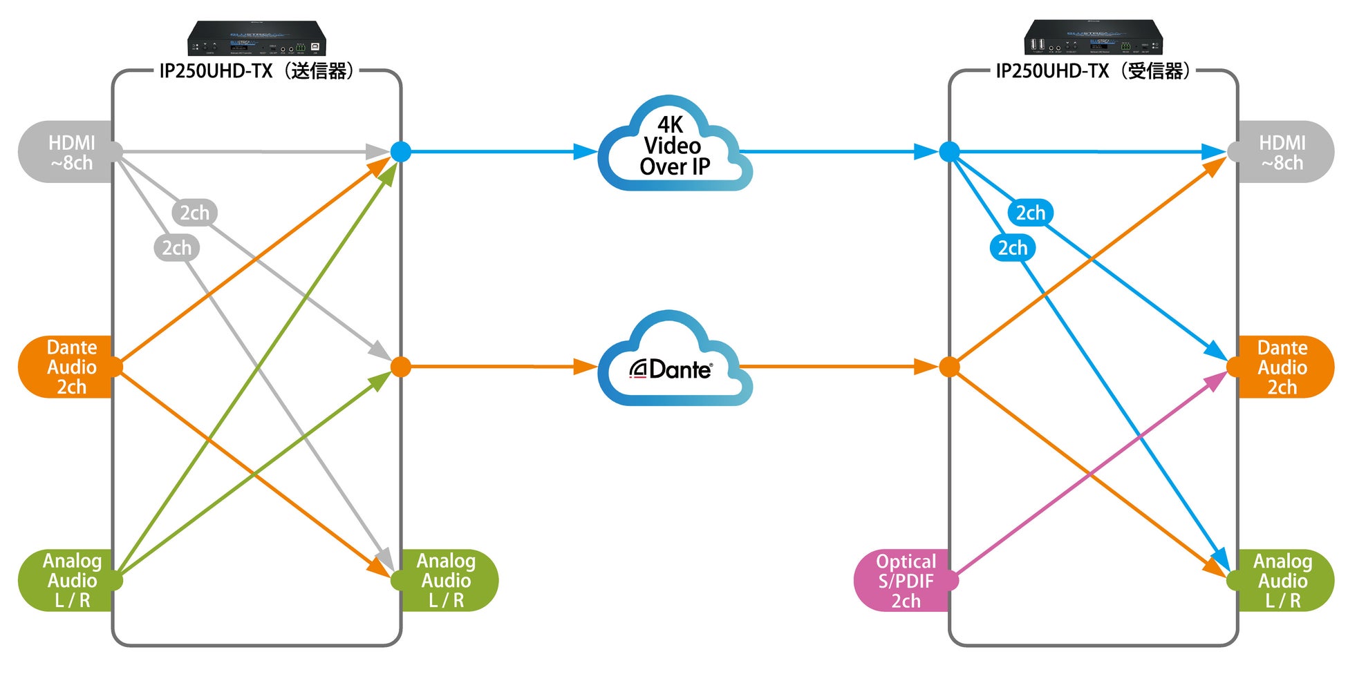 業界標準のDante規格に対応しており、映像/音声を分離して制御が可能。HDMI信号上に重畳された2chのオーディオ信号をDanteオーディオ信号として個別にエンコードまたは、デコードしHDMI出力端子へのエンベデッドが可能。ビデオ/オーディオ信号を任意にルーティングが可能です。