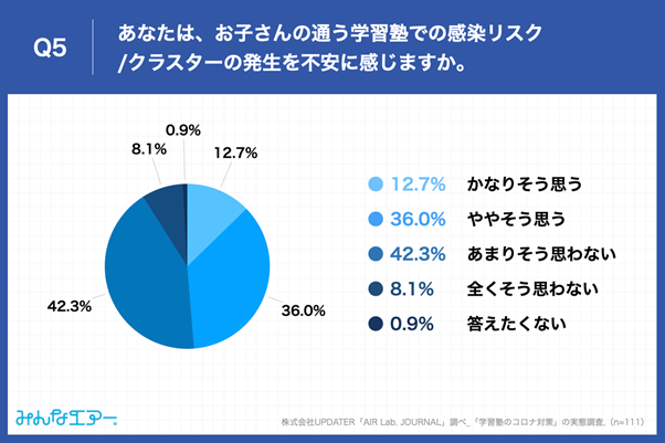 「Q5.あなたは、お子さんの通う学習塾での感染リスク/クラスターの発生を不安に感じますか。」(n=111)と質問したところ、「かなりそう思う」が12.7%、「ややそう思う」が36.0%という回答となりました。