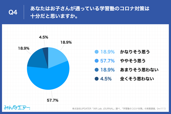 「Q4.あなたはお子さんが通っている学習塾のコロナ対策は十分だと思いますか。」(n=111)と質問したところ、「かなりそう思う」が18.9%、「ややそう思う」が57.7%という回答となりました。